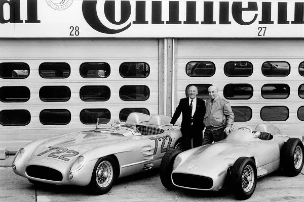 Moss (left) with Mercedes teammate, arch-rival, and friend Juan Manuel Fangio in 1991